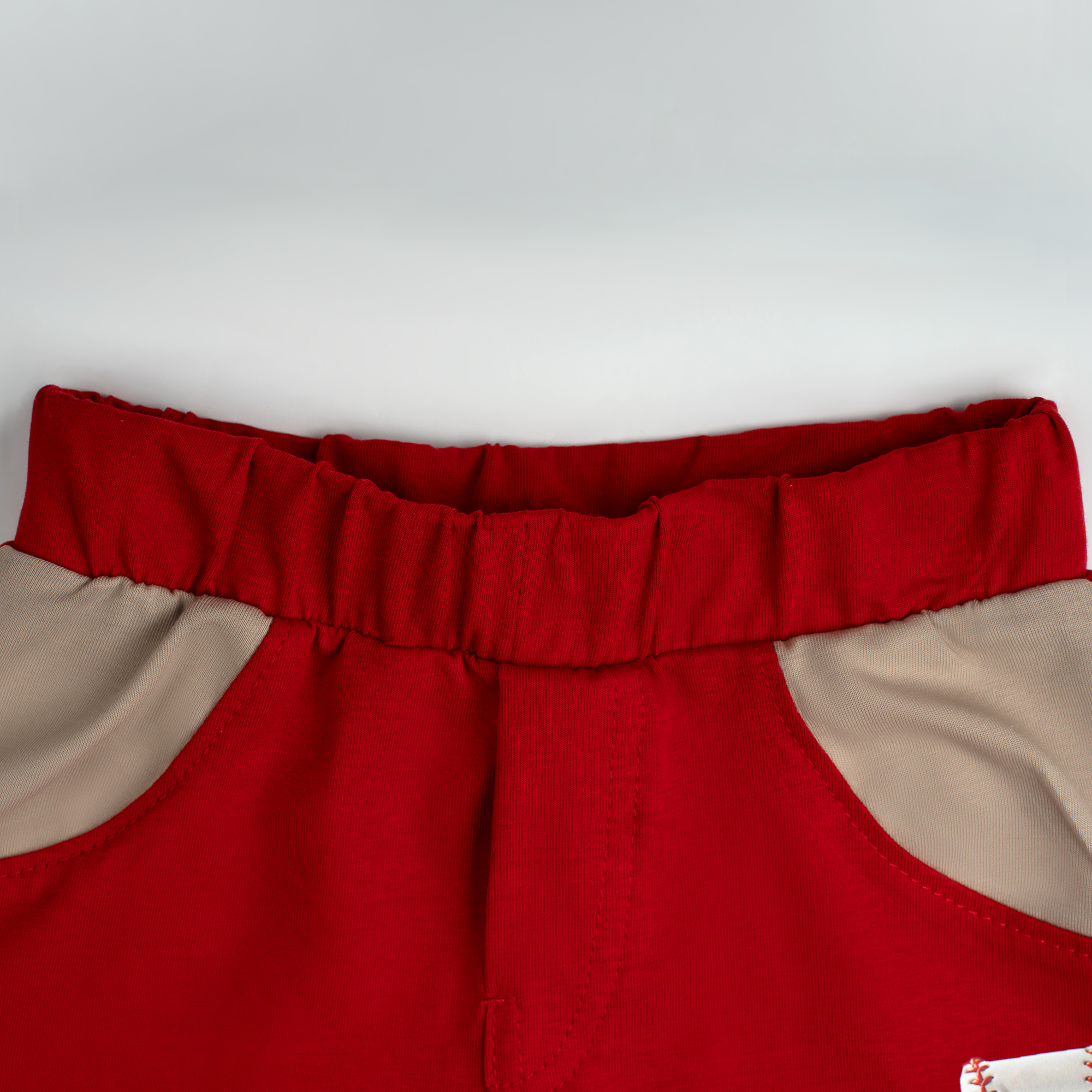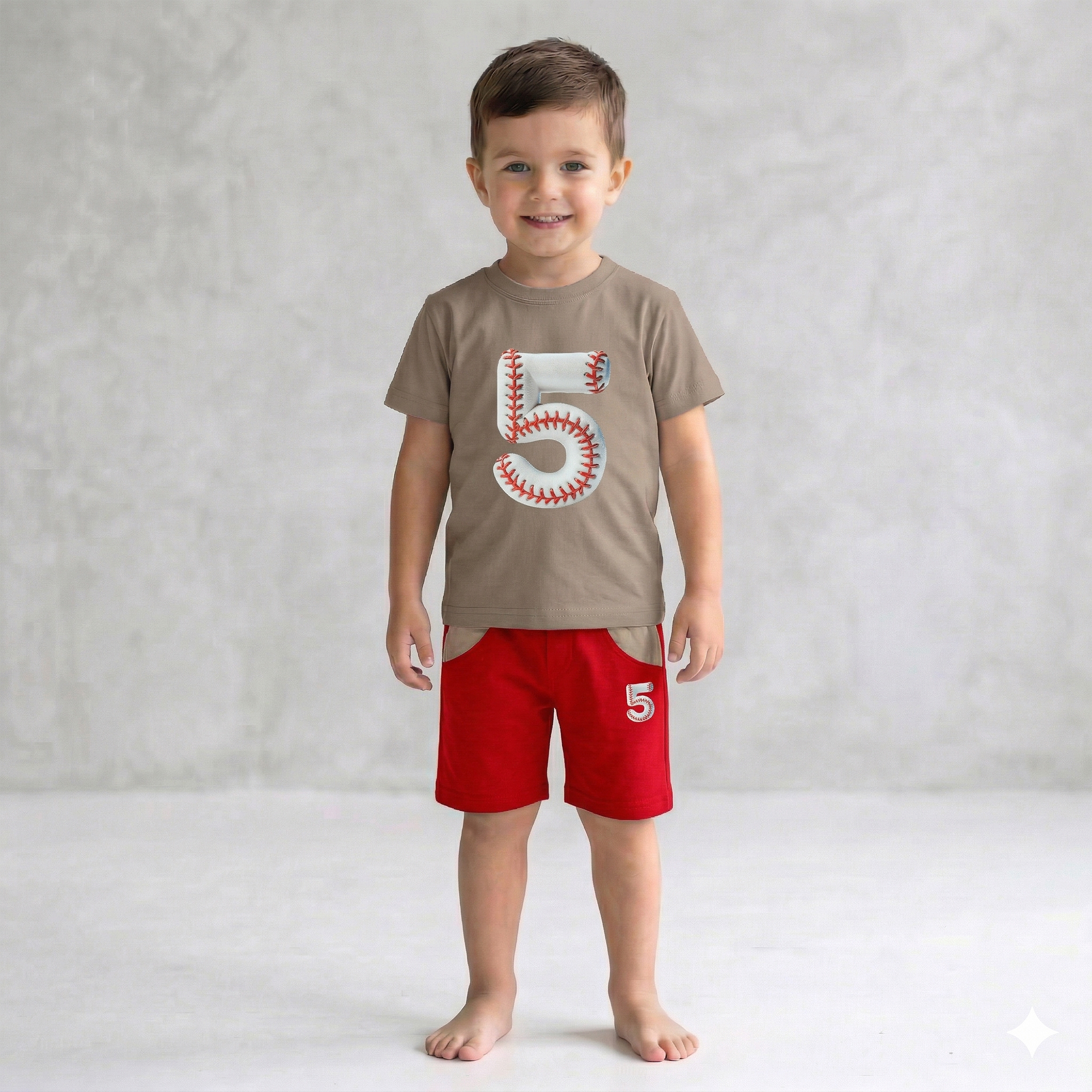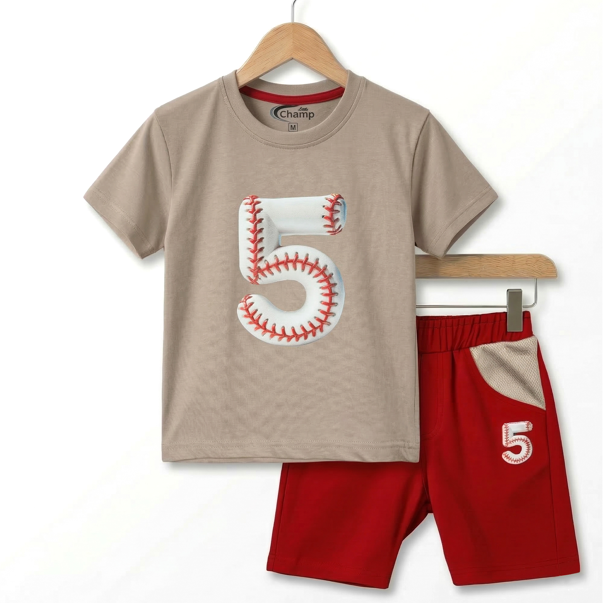 This is a modern and stylish two-piece summer set from the “Little Champ” collection. Combining a trendy neutral taupe t-shirt with bold red shorts, this set features a unique baseball-themed “Number 5” design, offering a sophisticated take on classic sportswear.