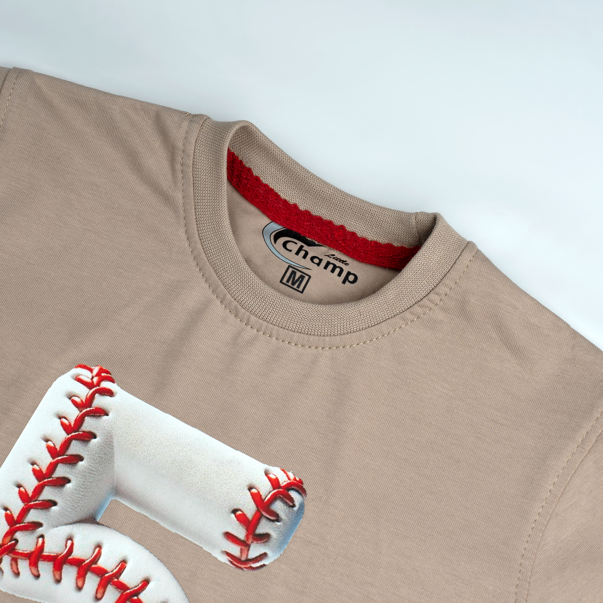 • Branding: The “Little Champ” logo and size “M” are printed on the internal neck label.