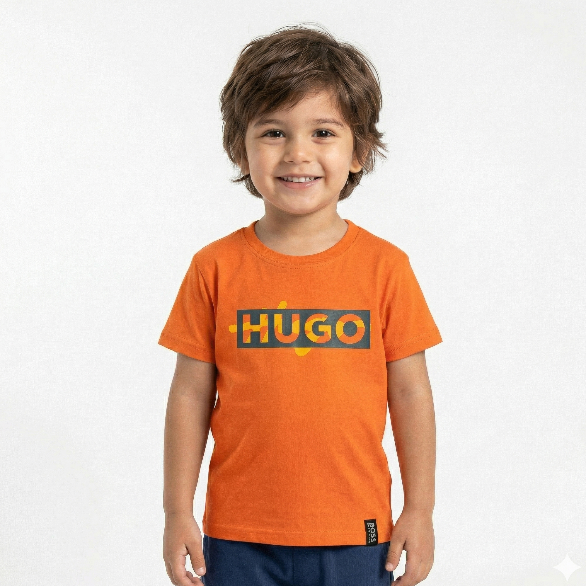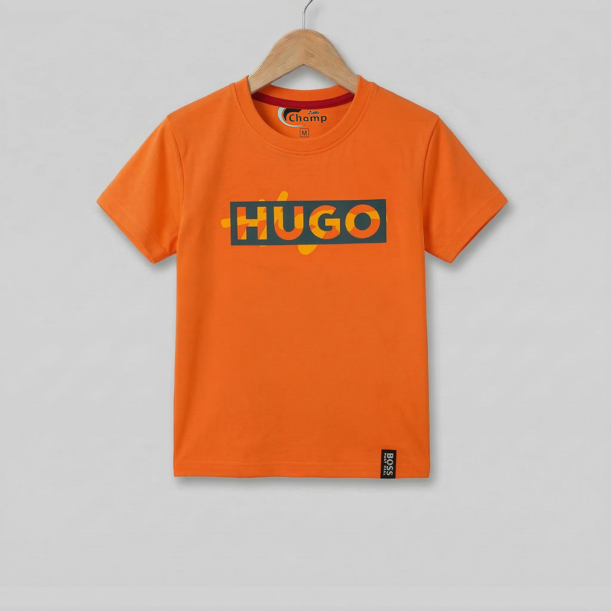 This is a bold and energetic orange children’s t-shirt, curated under the “Little Champ” private label. Featuring a striking box graphic and a dynamic color palette, this tee balances an athletic street-wear style with comfort, making it a standout staple for any young adventurer.
