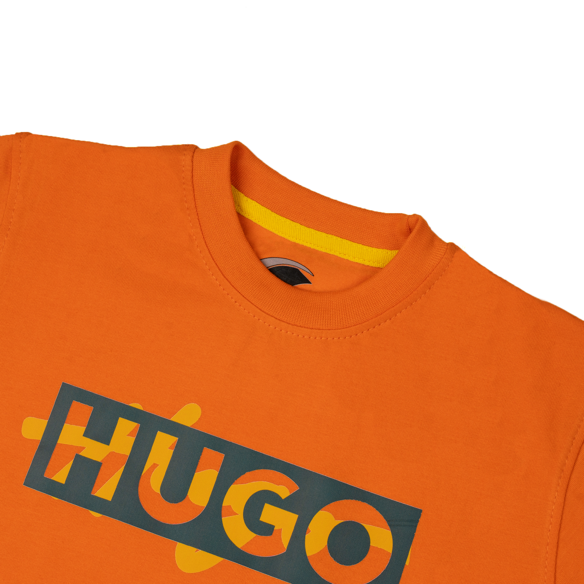 Graphic: Centered on the chest is a bold rectangular graphic. It features the name “HUGO” in a stylized, multi-colored format—with orange, yellow, and red letters contained within a dark grey or black box, creating a modern, structured visual impact.