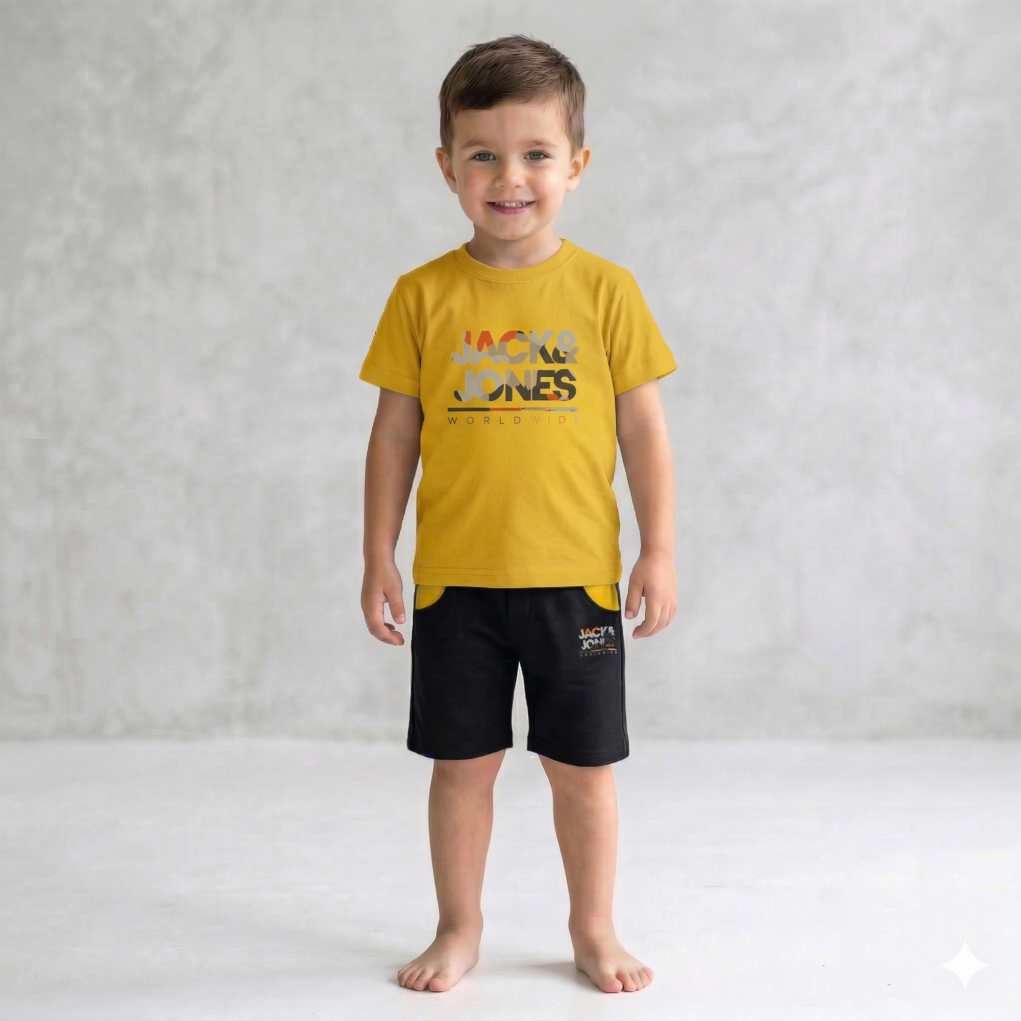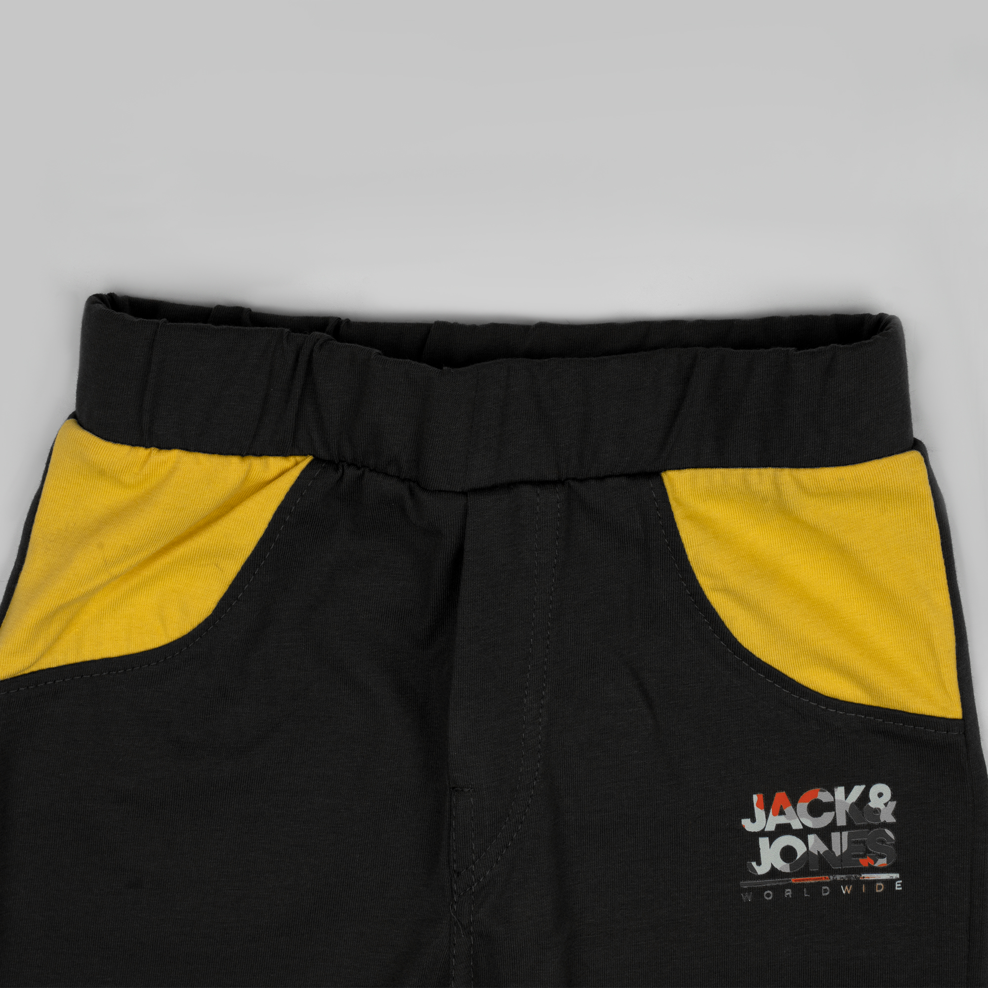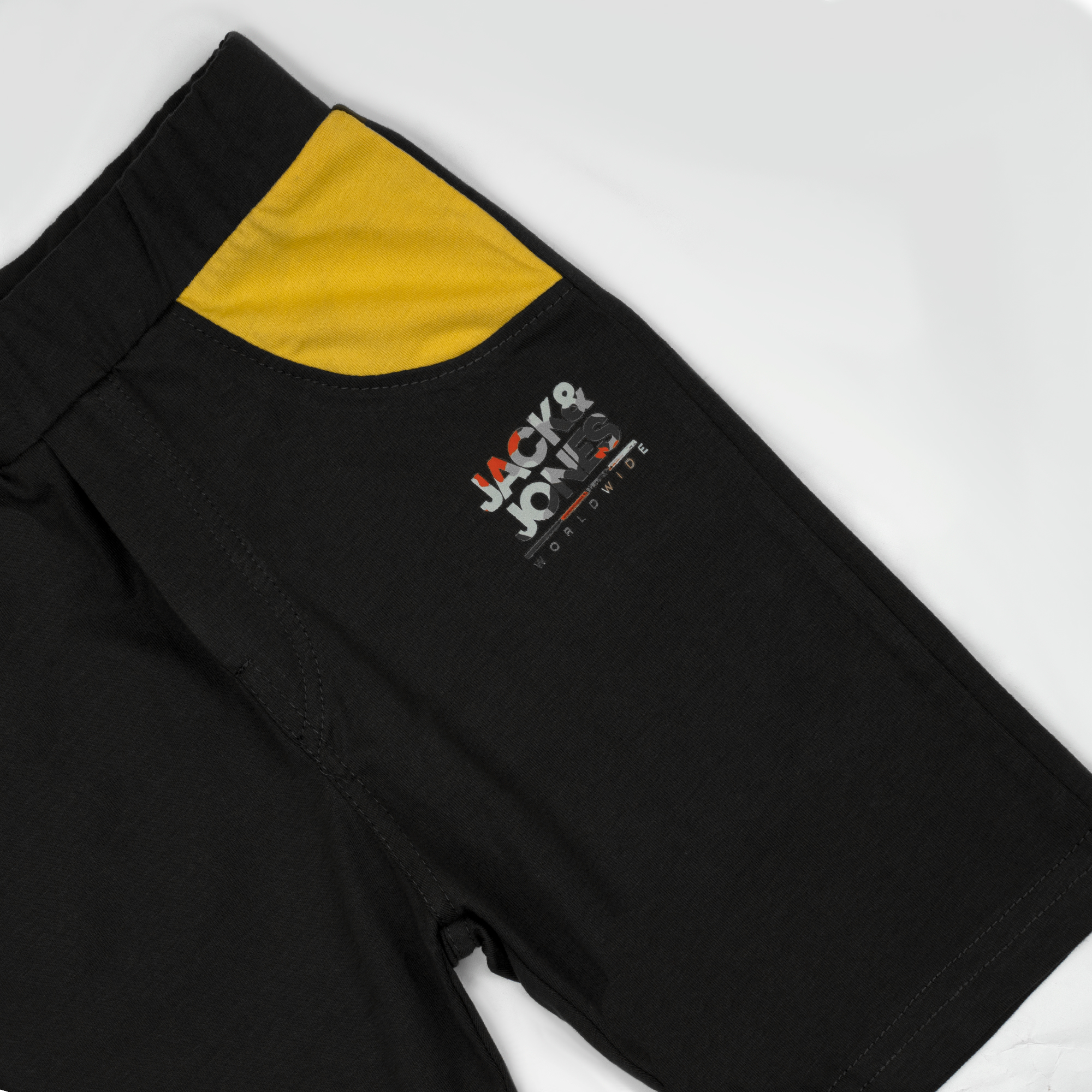 Shorts Design: The black shorts feature a coordinated mustard yellow pocket accent and a smaller version of the “JACK & JONES” logo on the left leg, tying the whole outfit together.