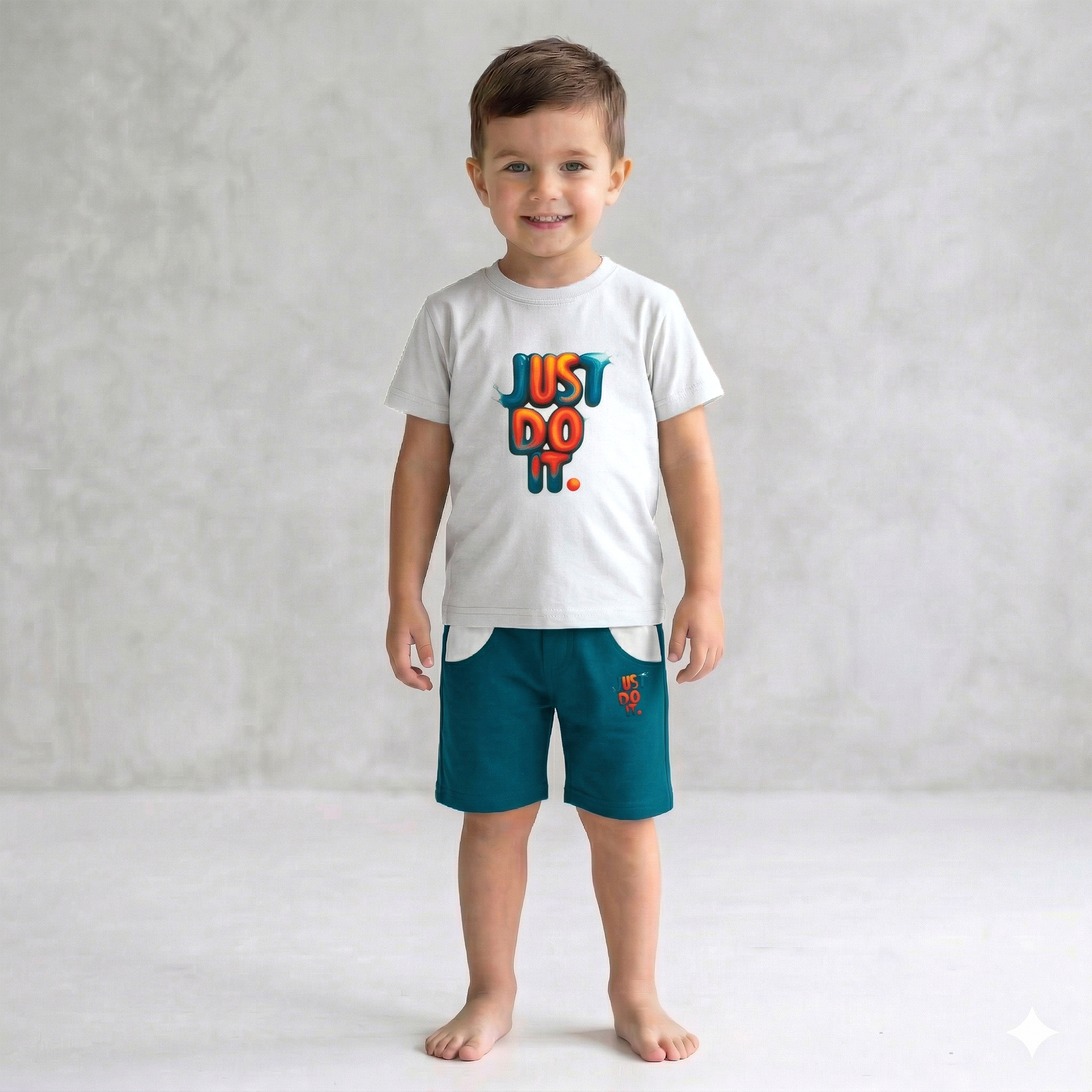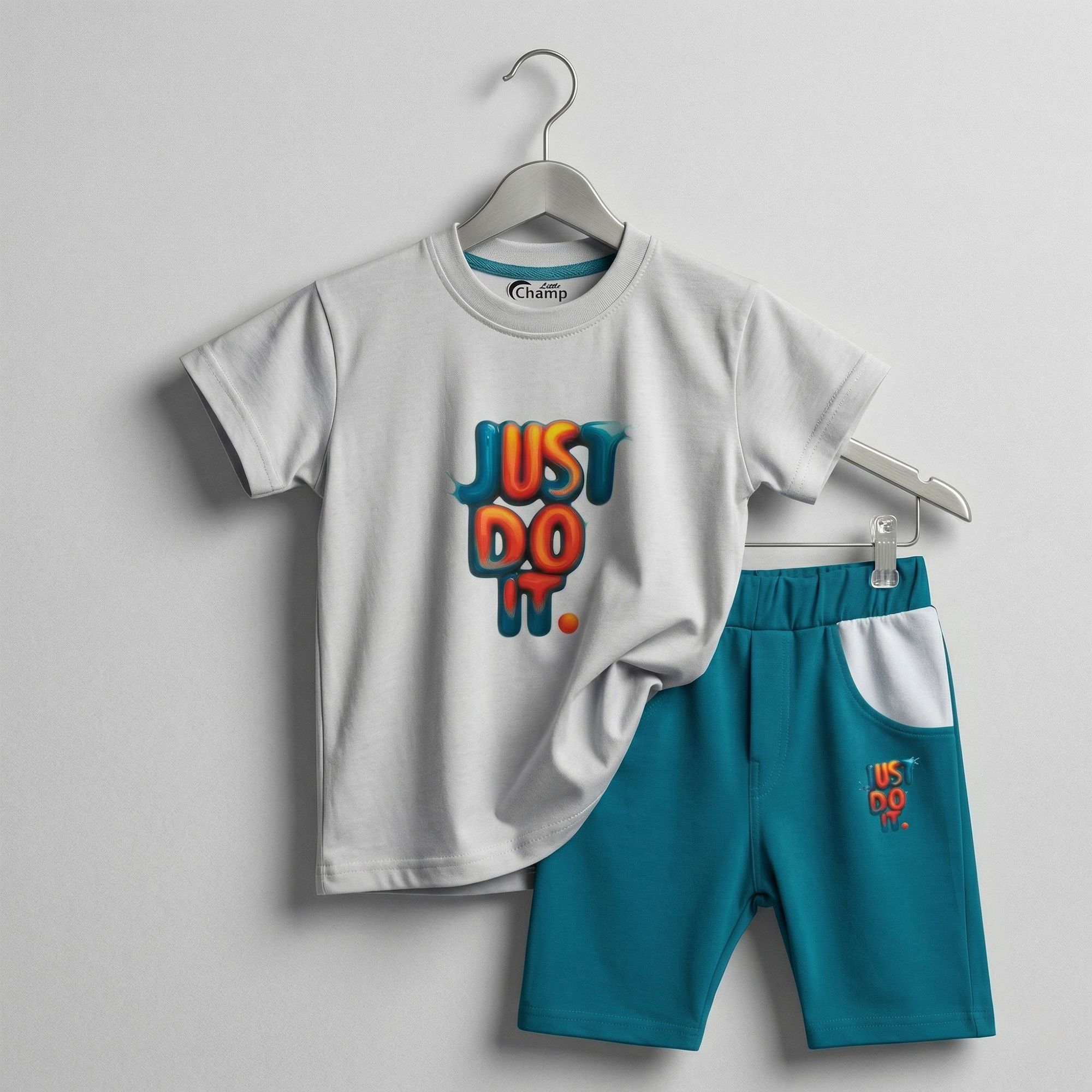 This is a cool and contemporary two-piece summer set from the “Little Champ” brand. This ensemble pairs a crisp off-white t-shirt with deep teal-blue shorts, featuring a bold 3D-effect graphic that brings a fresh, urban energy to a classic athletic style.
