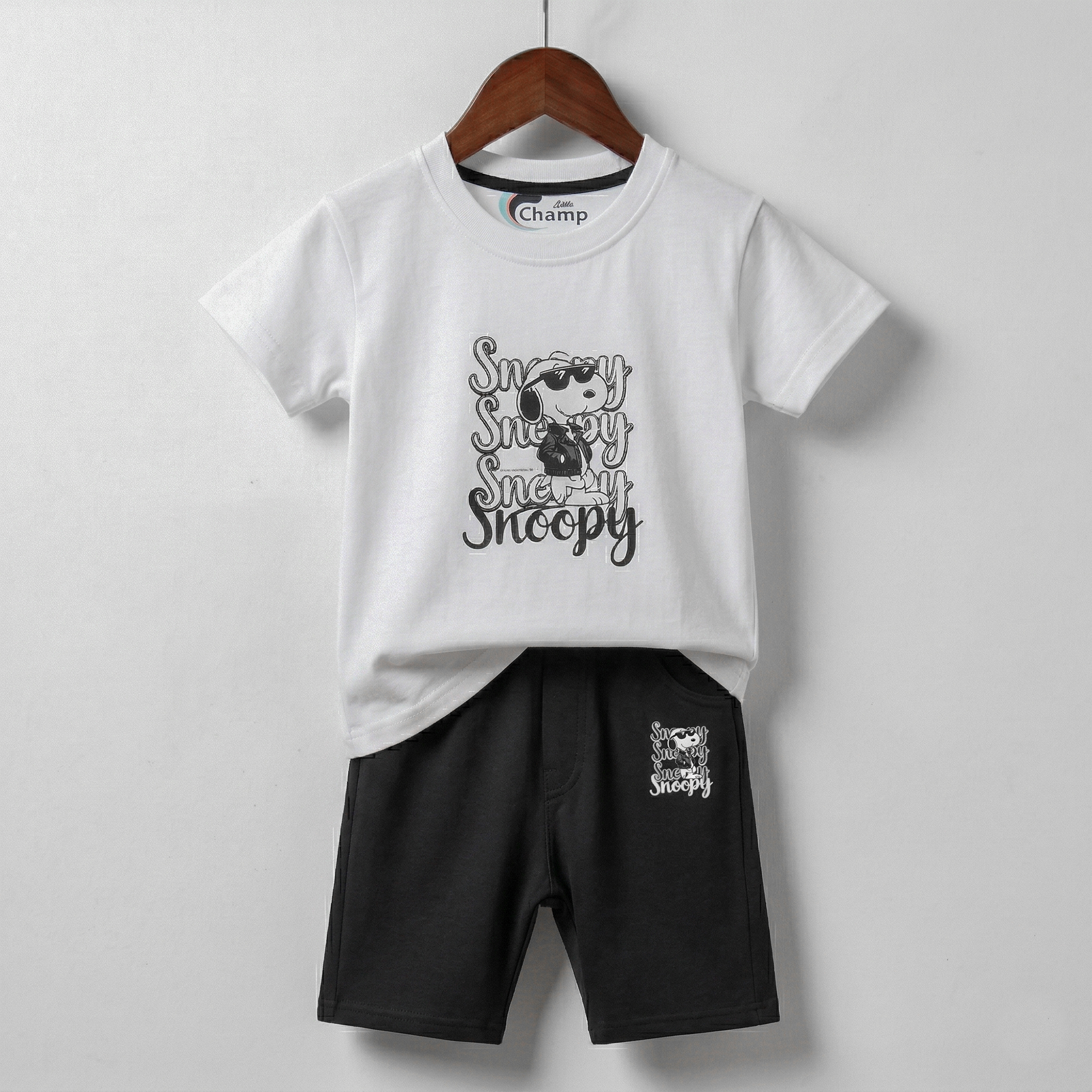 This is a classic and stylish two-piece summer set for children from the “Little Champ” brand. Featuring a timeless monochrome color palette, this outfit pairs a crisp white graphic tee with coordinating black shorts for a versatile, “ready-to-go” ensemble.