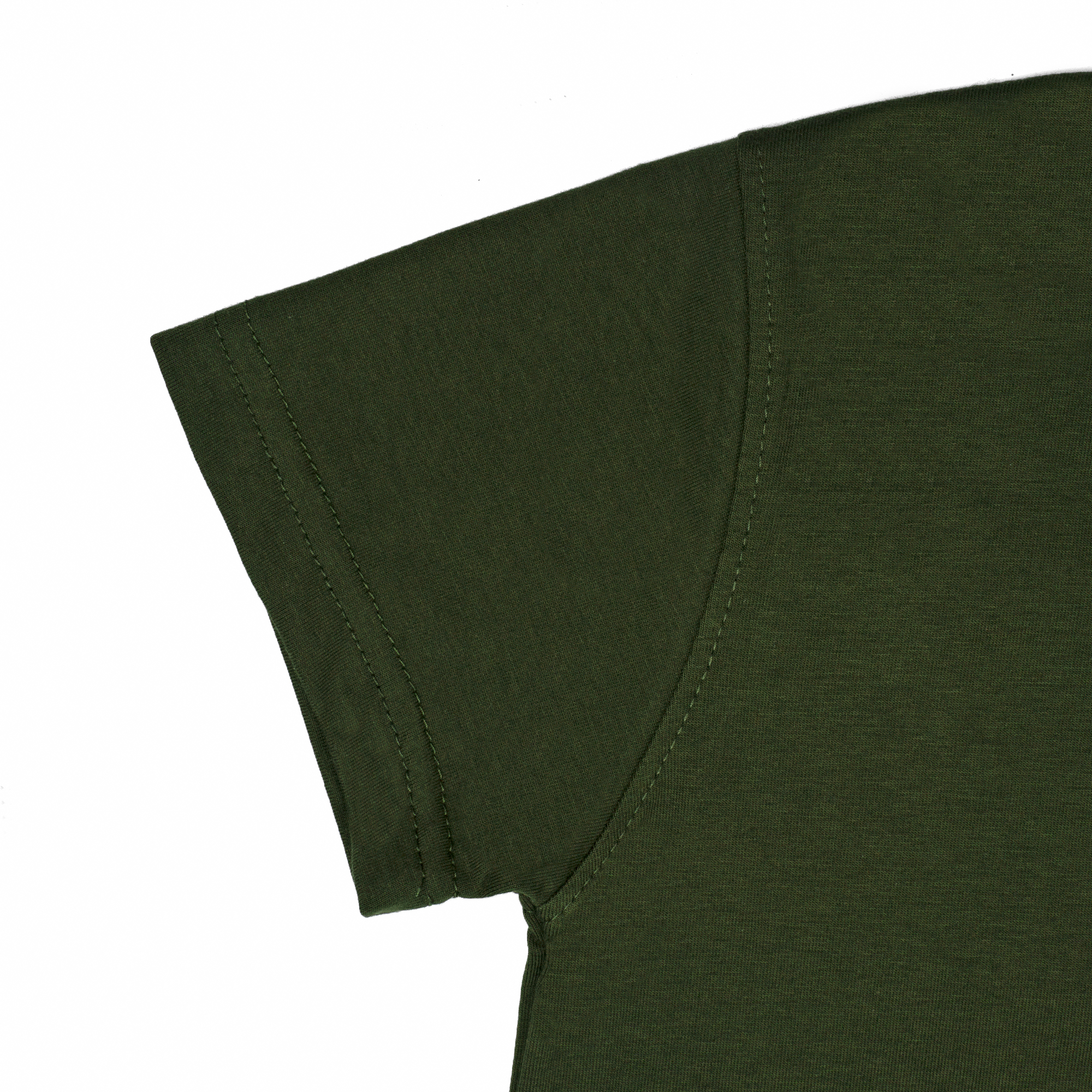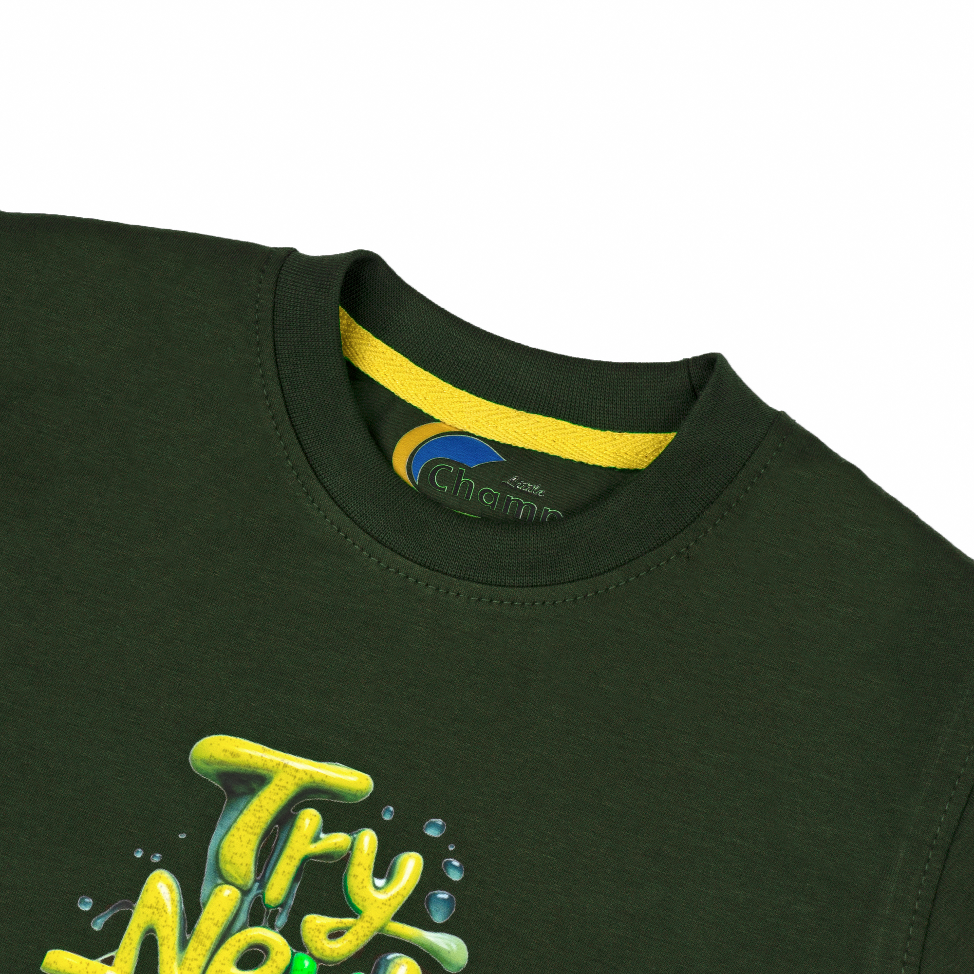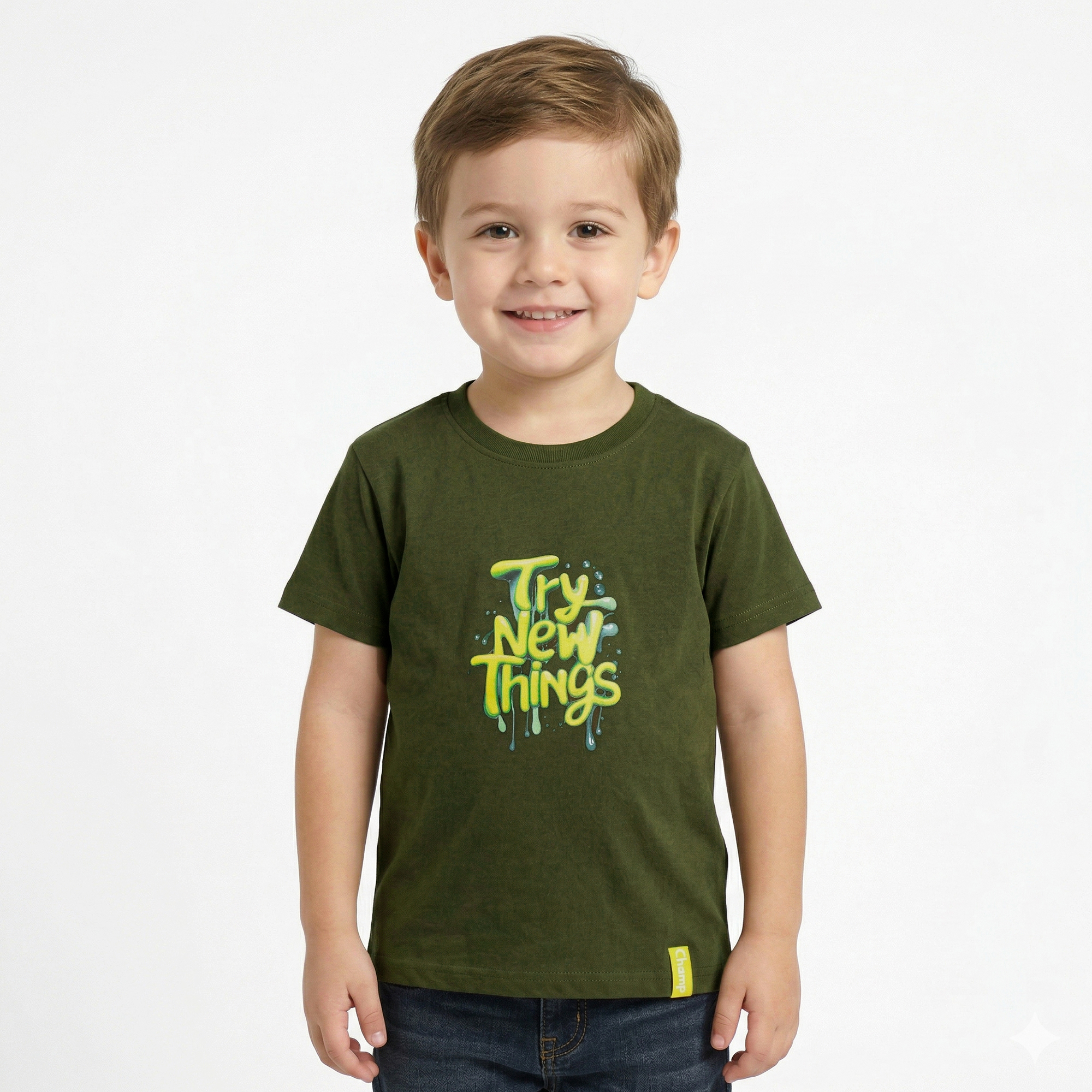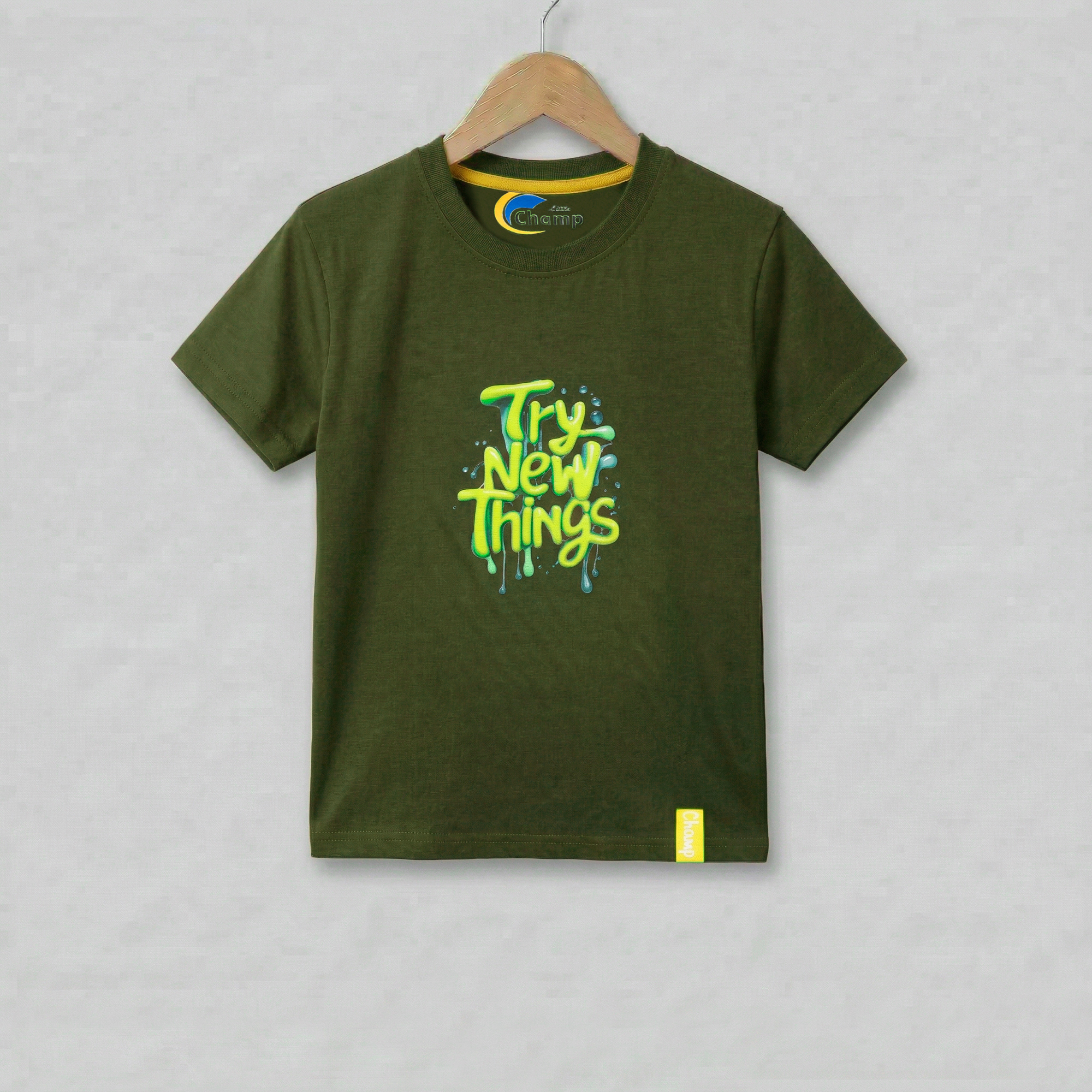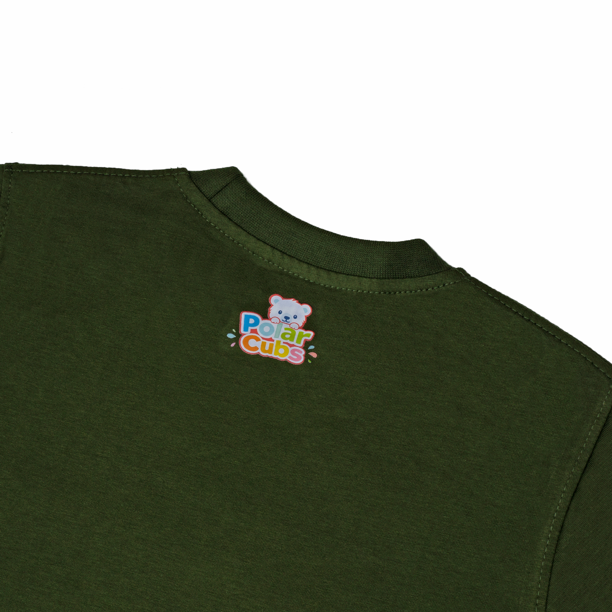 This is an earthy yet electric olive green t-shirt for children from the “Little Champ” brand. Featuring a sophisticated dark base paired with a neon-inspired graphic, this tee offers a cool, adventurous look for any young explorer.