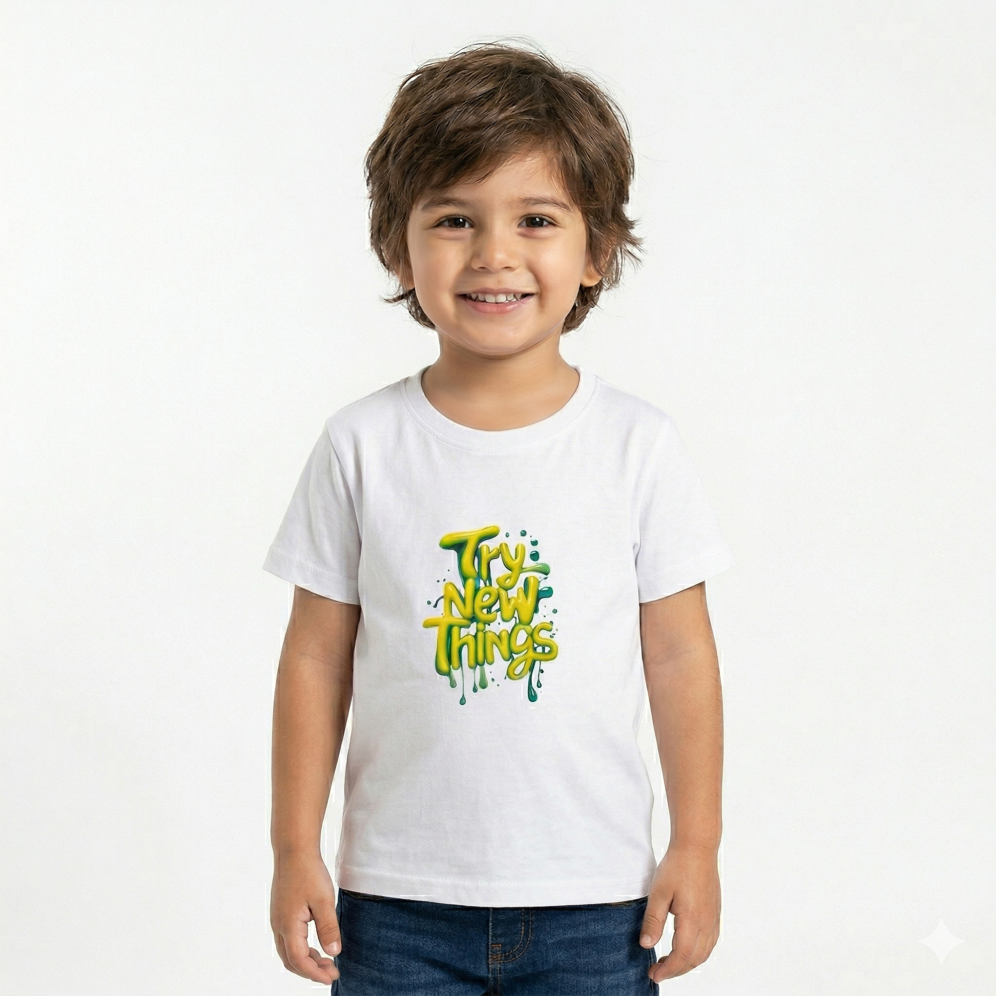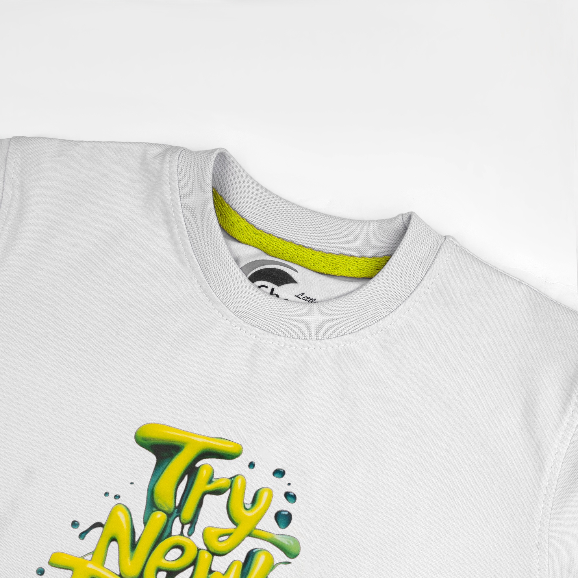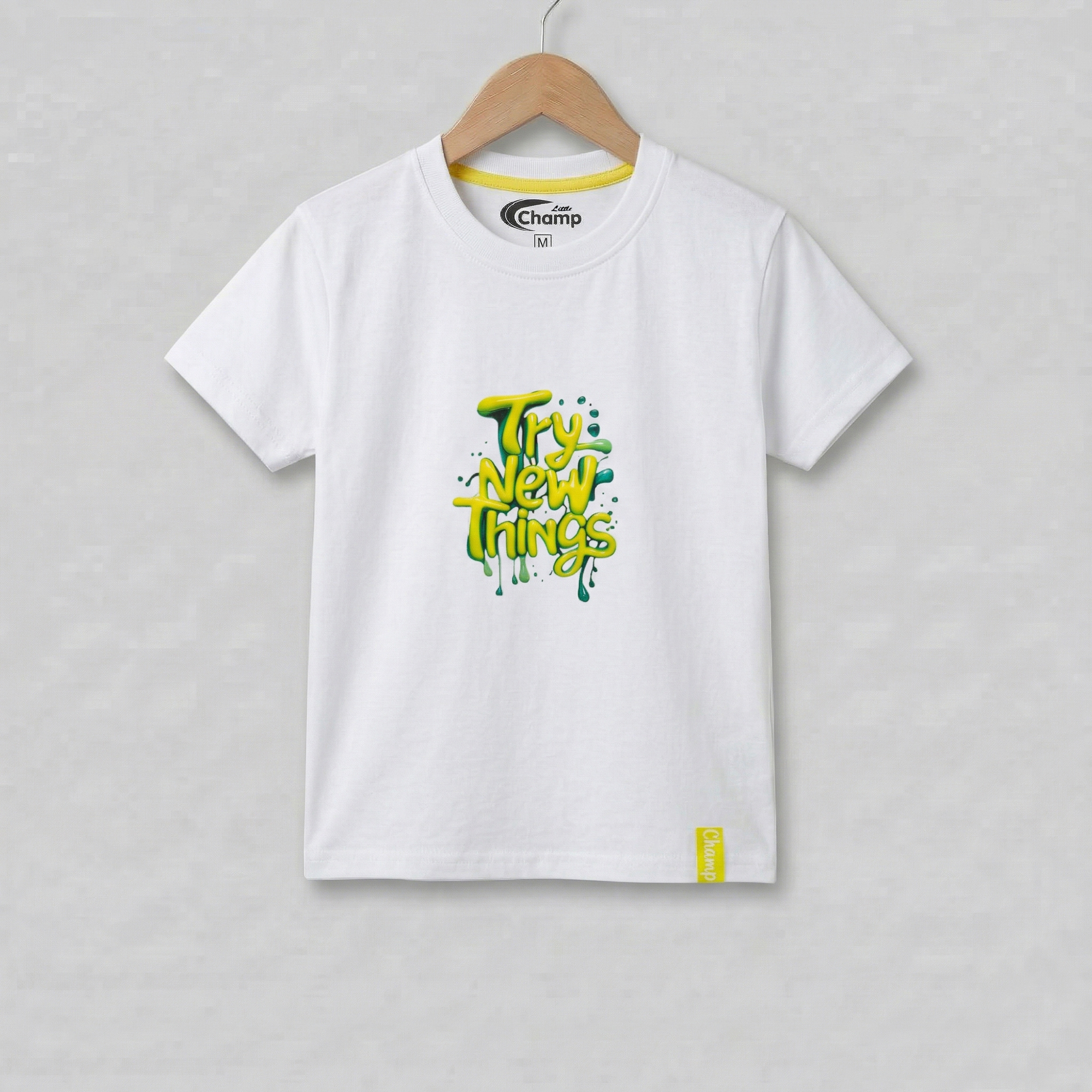 This is a clean, crisp white crew-neck t-shirt for children from the “Little Champ” collection. It features a bold, graffiti-inspired graphic that brings a splash of energy to a classic wardrobe staple.