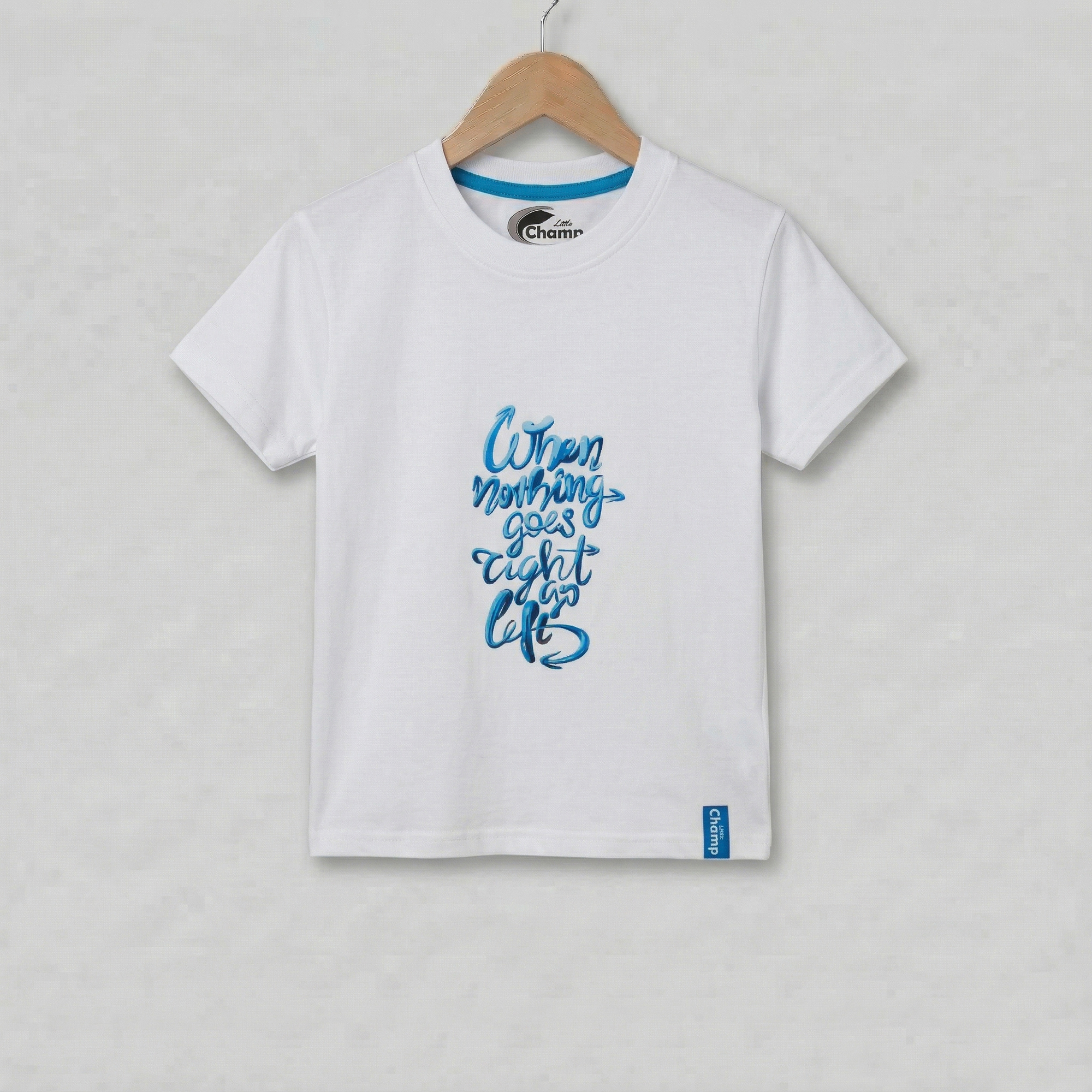 This is a white children’s t-shirt from the brand “Little Champ.” It features a casual, playful design with a motivational typographic graphic centered on the chest.